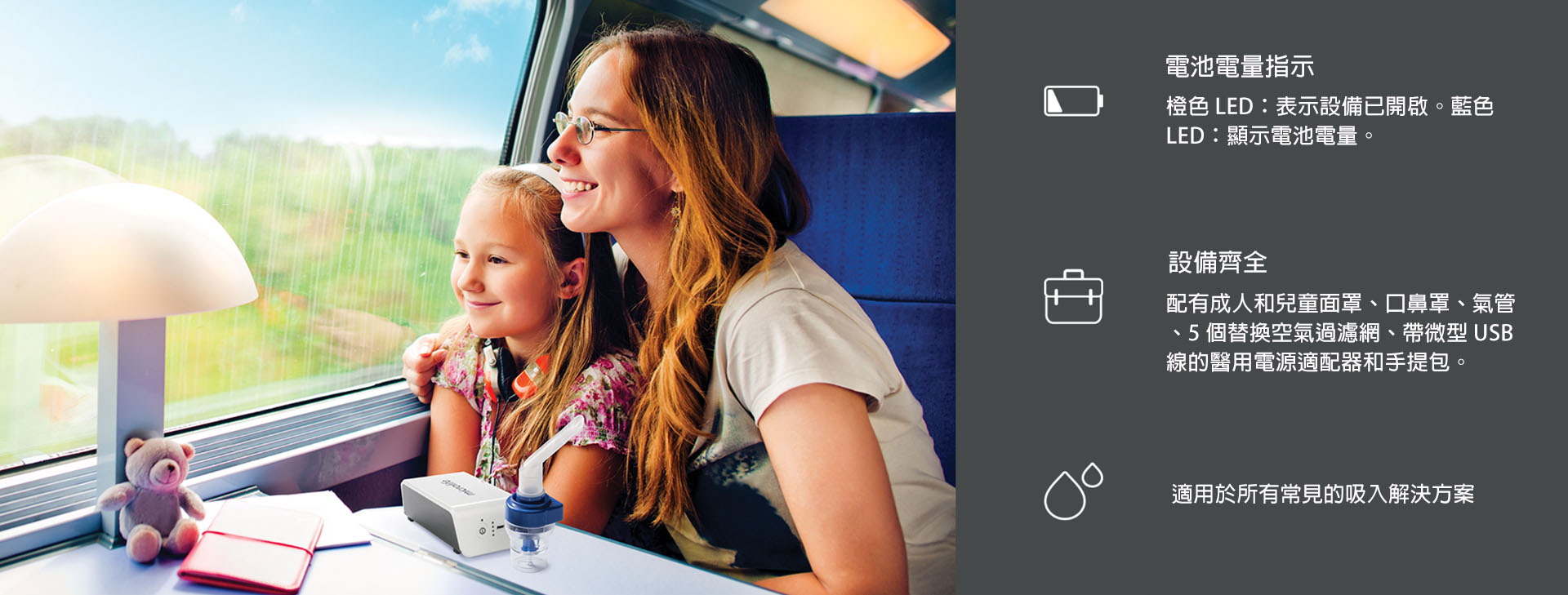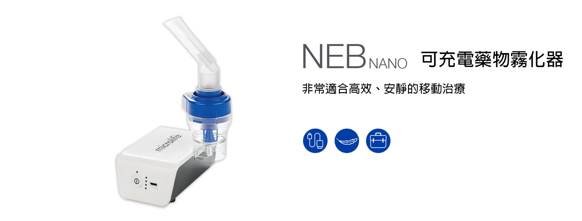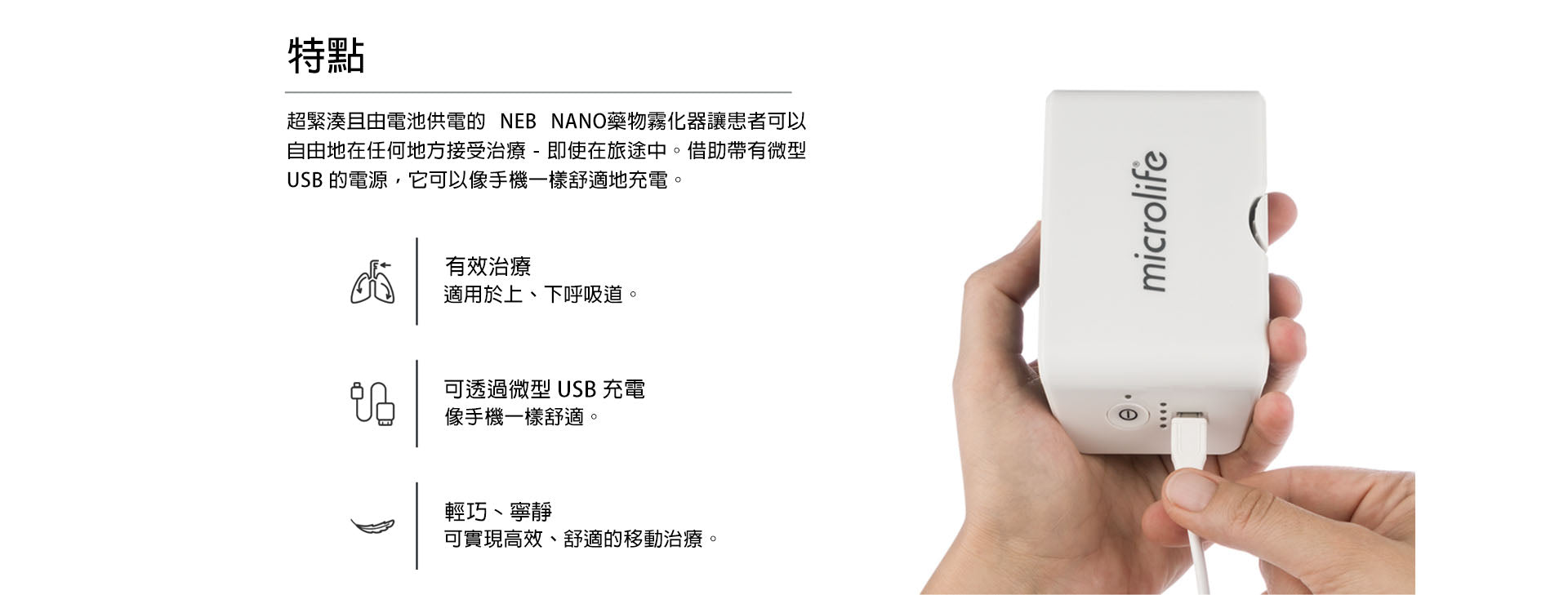 超緊湊且由電池供電的 NEB NANO藥物霧化器讓患者可以自由地在任何地方接受治療 - 即使在旅途中。借助帶有微型 USB 的電源接口,可以像手機一樣方便地充電。